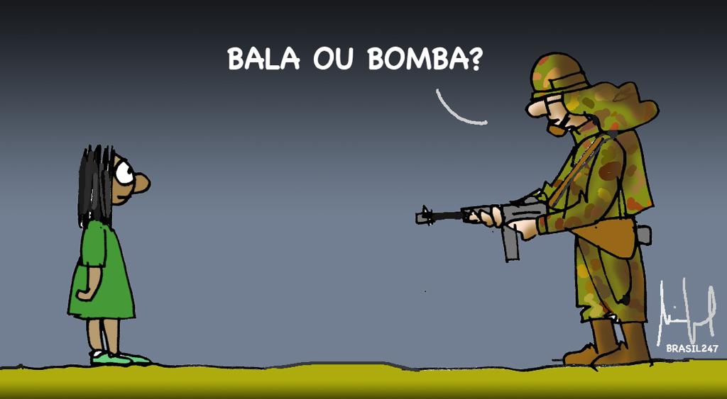 O Halloween acontece agora no final de outubro. Veio dos Estados Unidos como vêm as bombas sobre os palestinos. Na festa dos monstros americana as crianças perguntam ?doce ou travessura?? Em Gaza os soldados perguntam ?bala ou bomba?? A resposta já prevê uma consequência desastrosa. O povo palestino de Gaza está sendo exterminado com requintes do horror do Halloween sem atenuantes de festa. É só o lado monstruoso e fantasmagórico que prevalece. Israel abusando do seu direito de autodefesa depois do ataque cruel do Hamas elimina um povo inteiro.